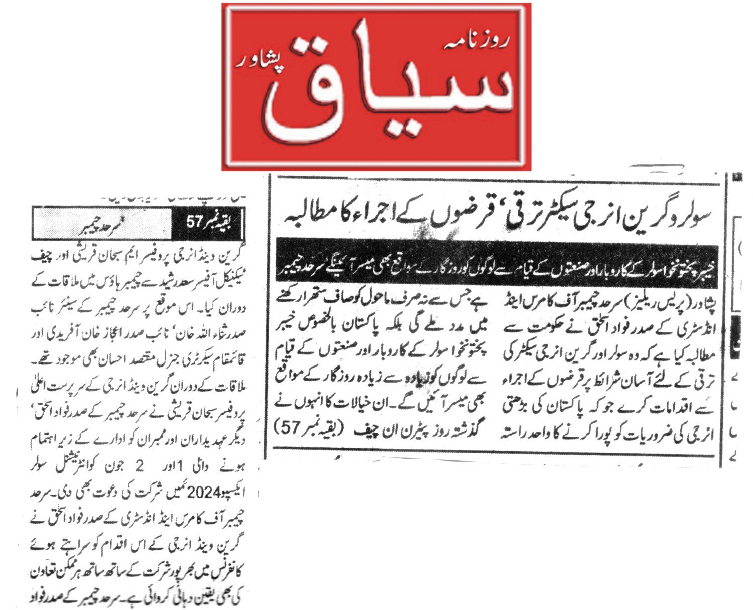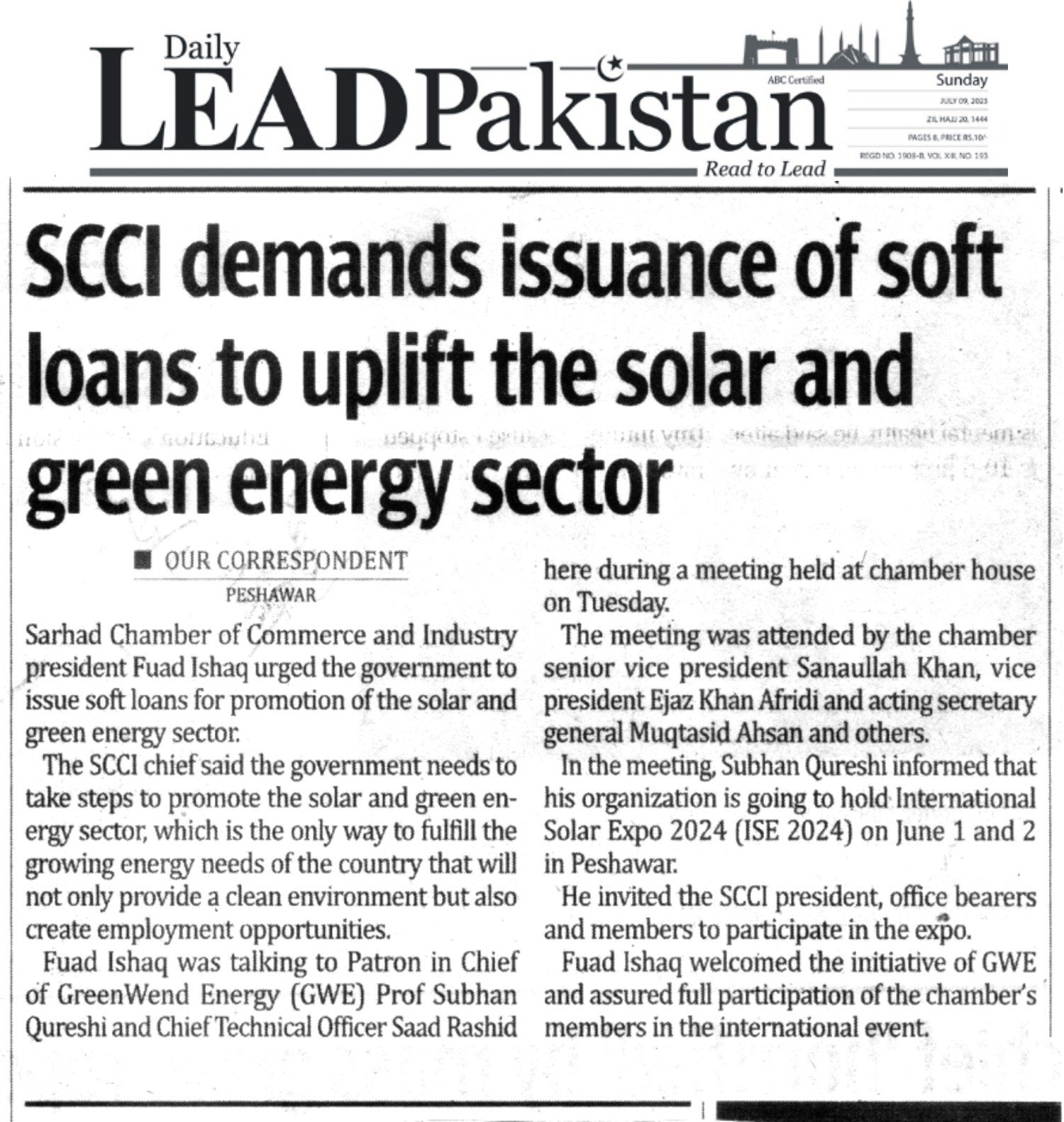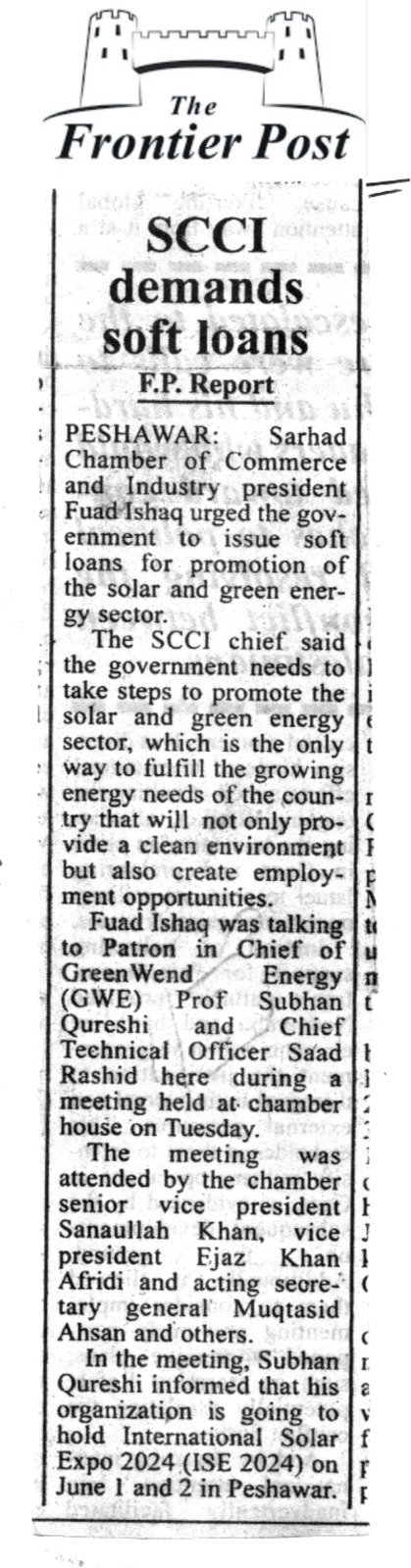 In the meeting, Subhan Qureshi informed that his organization is going to hold International Solar Expo 2024 (ISE 2024) on June 1 and 2 in Peshawar, powered by #SunSaviour. He invited the SCCI president, office bearers and members to participate in the expo.