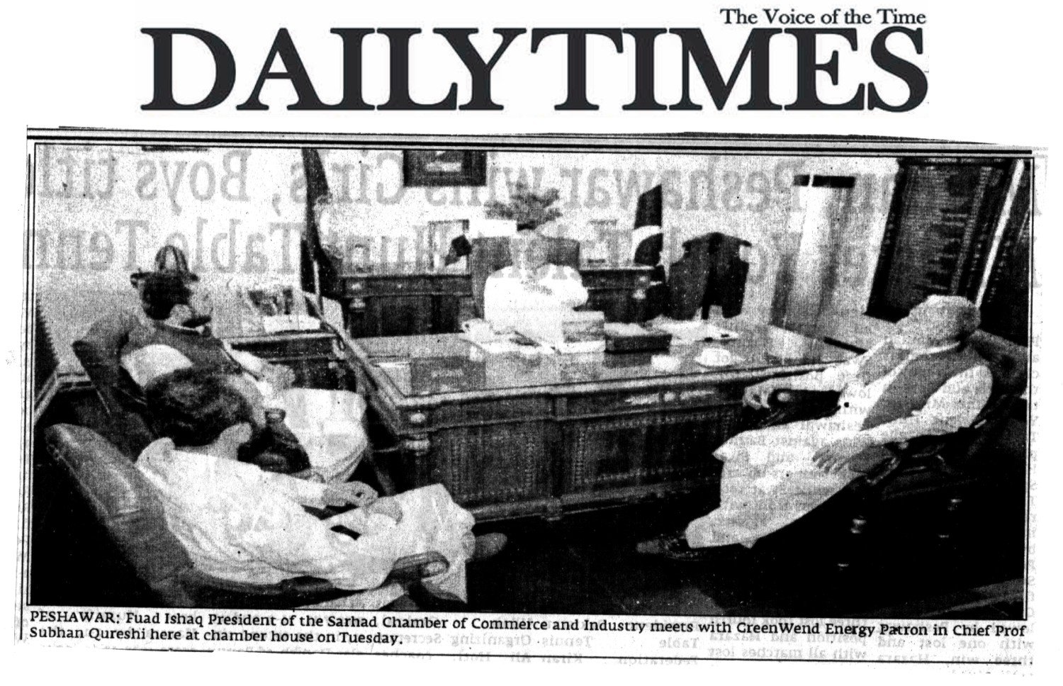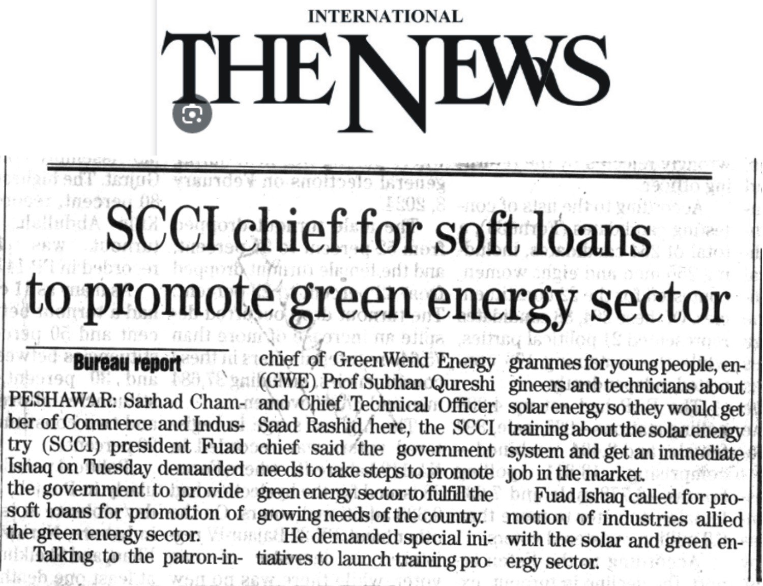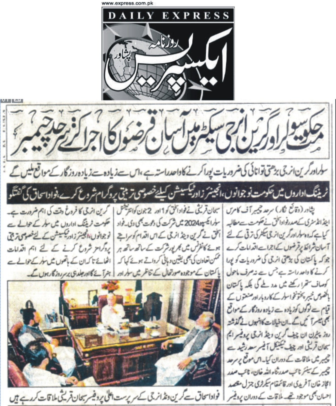 Fuad Ishaq was talking to Patron in Chief of Green Wend Energy (GWE) Prof Subhan Qureshi and Chief Technical Officer Saad Rashid here during a meeting held at chamber house on Tuesday.