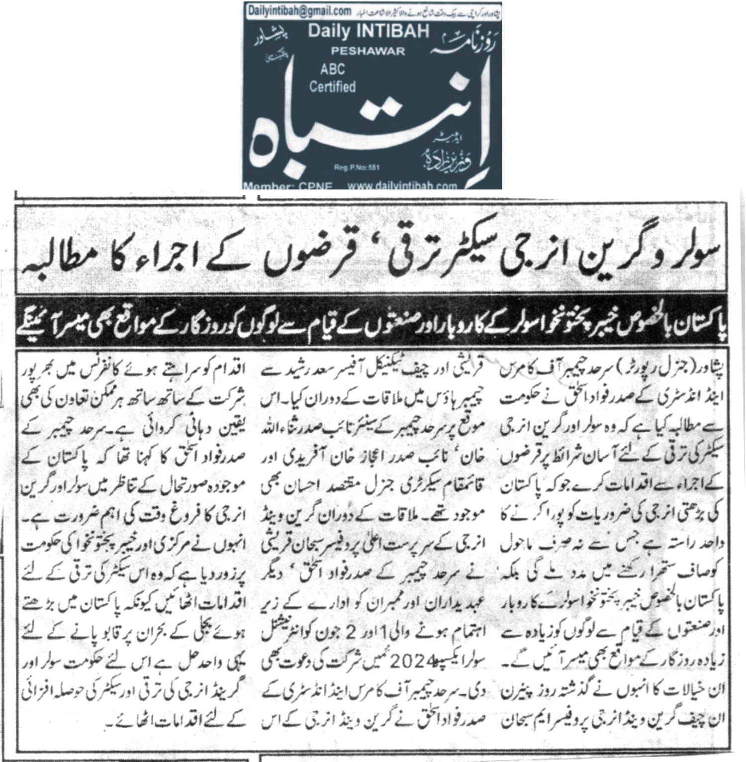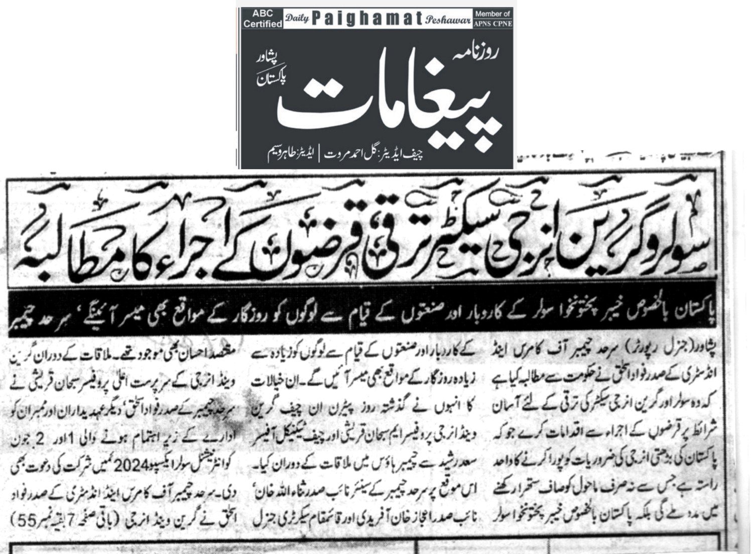PESHAWAR, Apr 23 (APP): Sarhad Chamber of Commerce and Industry president, Fuad Ishaq urged the government to issue soft loans for promotion of solar and green energy sector in the province.